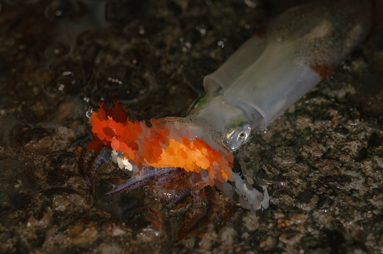 2.3S(シャロータイプ)のエギにチェンジし、ゆっくりとした誘いに切り替えた直後、ロッドティップに明確なアタリ!